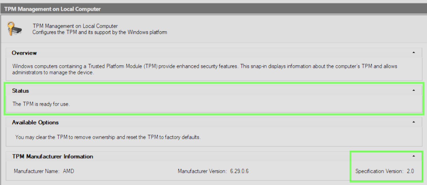 If you see a message that says “The TPM is ready for use” along with “Specification Version: 2.0” as pictured above, TPM 2.0 is set up correctly and you may proceed toStep 2.