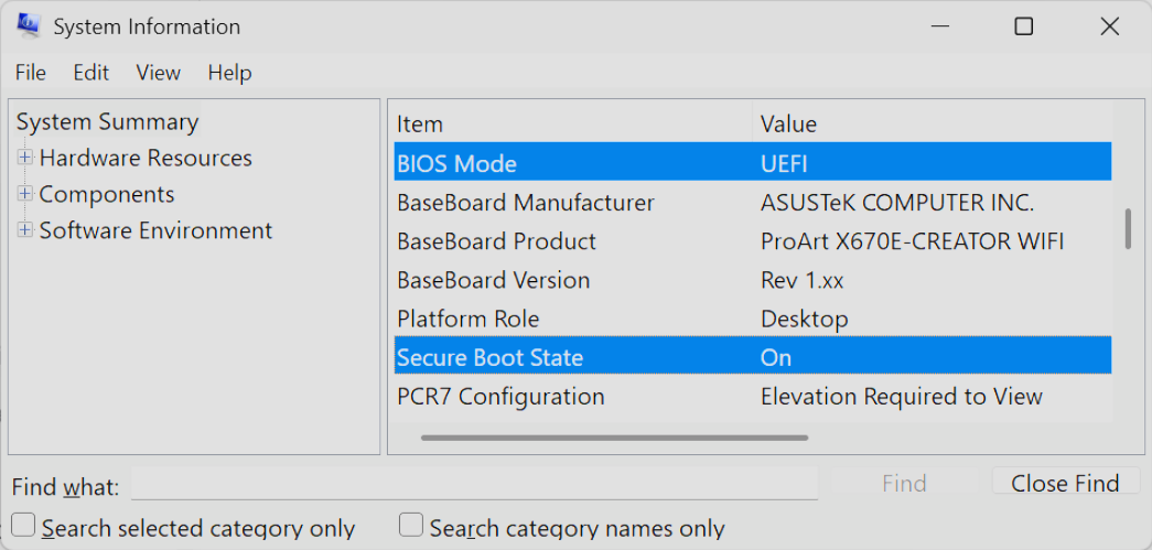 Pictured above is the desired configuration, and if you see that both the BIOS Mode is UEFI and the Secure Boot State is On, you’re all set and no changes are needed.