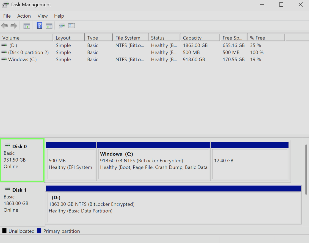 Identify the disk associated with your Windows installation. This is indicated above in green region. Many systems may only have one disk, but some may have two or more depending on the hardware you have installed.