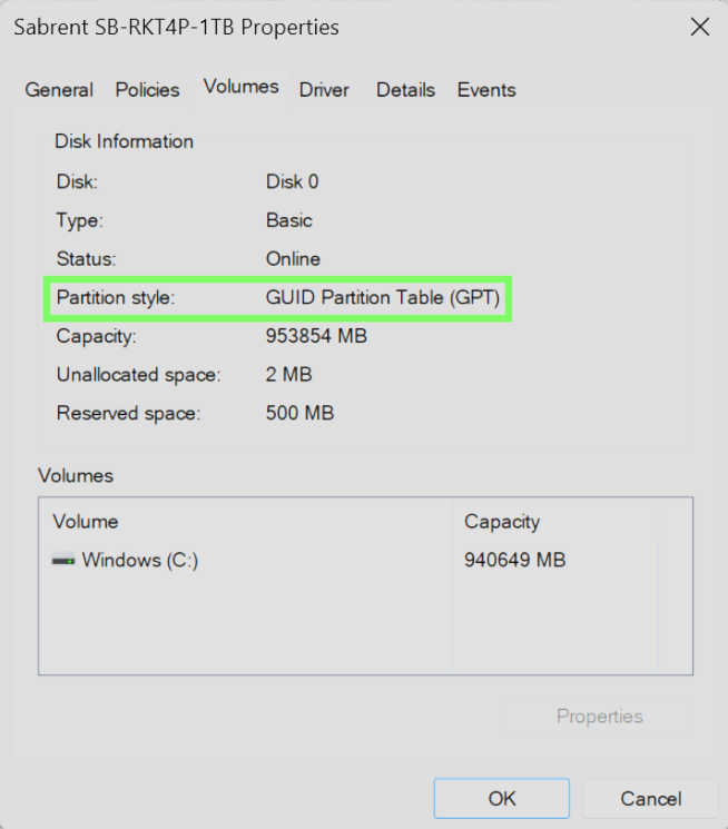 Right click the disk and selectProperties. Then, select theVolumes tab to view the property window below.