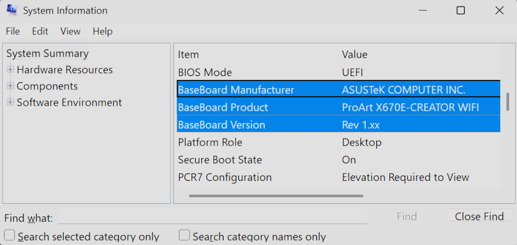 To identify your motherboard model, Press[Win]+R or selectRun from the Start menu. Typemsinfo32 in the dialog and hitEnter or selectOK to bring up theSystem Information window shown below.